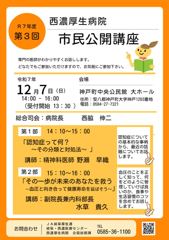 【西濃厚生病院】12/7(日) 第3回 市民公開講座「認知症」「高血圧」をテーマに開催します!