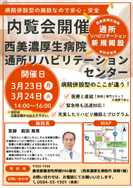 【西美濃厚生病院】「通所リハビリテーションセンター」新規開設に伴う内覧会開催のお知らせ