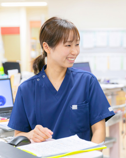 私は消化器、血液内科で勤務しています。内視鏡治療や、化学療法、輸血療法などのさまざまな内科的治療を学んでいます。内科病棟では、繰り返し入院をされる方も多く、ターミナル期に移行する患者さんもいます。ターミナル期の看護では、患者さん、ご家族との関わり方や看護師としてどのような看護を提供するべきか悩むこともありますが、先輩の指導のもとチームで協力しながら看護を行うことができるので安心です。また、患者さんやご家族からの「ありがとう」の声や、笑顔は励みとなっています。休日や勤務後は、同期や友達とリフレッシュしながら頑張っています。みなさんも一緒に働きませんか?