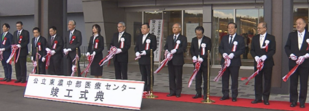 (テープカットで竣工を祝う関係者=13日午前、公立東濃中部医療センターにて_ぎふチャンニュース掲載より)