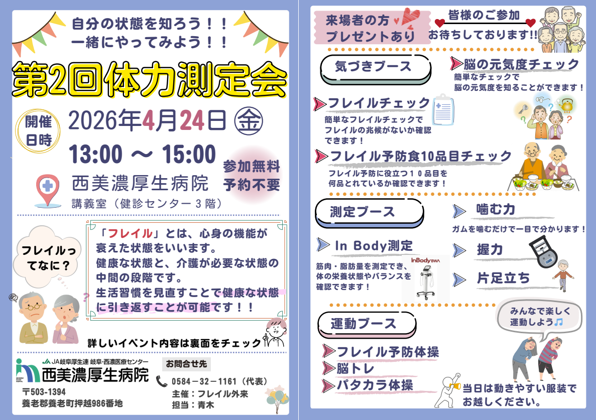 2026年03月10日 【西美濃厚生病院】4/24「第2回 体力測定会」開催のお知らせ(来場者プレゼントあり) JA岐阜厚生連 西美濃厚生病院では、地域の皆様の健康維持を目的とした体力測定会を開催いたします。 「フレイル(心身の機能が衰えた状態)」の状態を知り、予防に取り組むきっかけとしてぜひご活用ください。