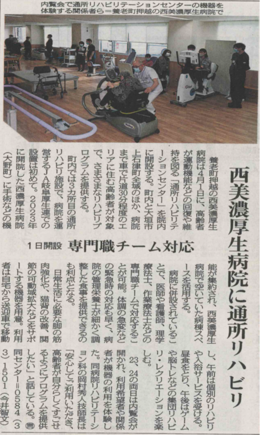 西美濃厚生病院「通所リハビリテーションセンター」が中日新聞で紹介されました