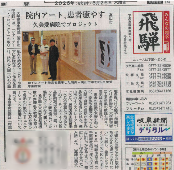 3月26日(木)の岐阜新聞 飛騨版に久美愛厚生病院「ケア・アート・プロジェクト」の取り組みが紹介(掲載)されました。(中日新聞 飛騨版には3月19日に掲載されました。)