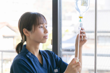 私は消化器、血液内科で勤務しています。内視鏡治療や、化学療法、輸血療法などのさまざまな内科的治療を学んでいます。内科病棟では、繰り返し入院をされる方も多く、ターミナル期に移行する患者さんもいます。ターミナル期の看護では、患者さん、ご家族との関わり方や看護師としてどのような看護を提供するべきか悩むこともありますが、先輩の指導のもとチームで協力しながら看護を行うことができるので安心です。また、患者さんやご家族からの「ありがとう」の声や、笑顔は励みとなっています。休日や勤務後は、同期や友達とリフレッシュしながら頑張っています。みなさんも一緒に働きませんか?